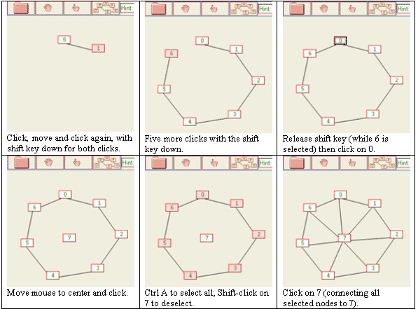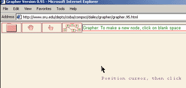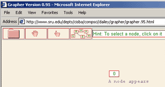 Grapher (available at http://srufaculty.sru.edu/david.dailey/grapher/grapher.96.html) is a web-based graph drawing package written in JavaScript* using VML* and XML. It is generally patterned in the tradition of MacDraw*. Like MacDraw and other programs for vector-based drawing that generally conform to its interface-design (Adobe® Illustrator®, Canvas, CorelDRAW®, Microsoft PowerPoint)*, a click on blank space adds to the drawing, while a click on an already drawn object selects that object. Transitions between the modes of adding a node, naming a node, adding a line, and moving a node are made by the software, rather than requiring an overt mode change command (as required by many extant graph drawing packages.)